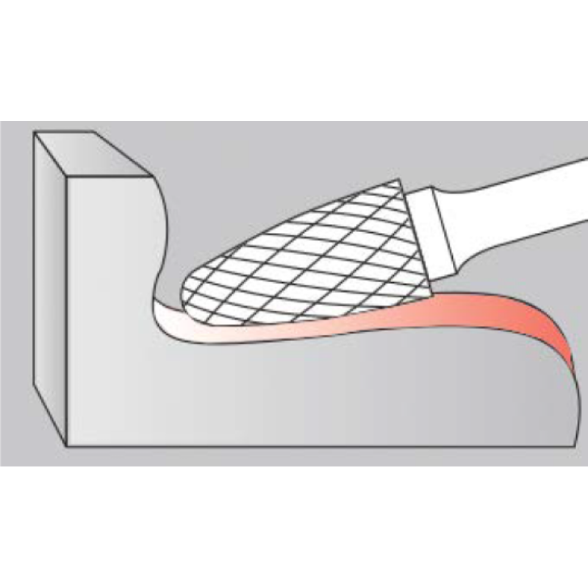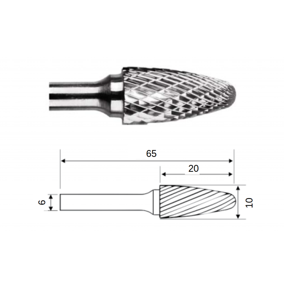 Твердосплавна борфреза тип F гіперболічної форми. Підходить для обробки вузьких форм металевих заготовок. Особливості: Діаметр циліндричного хвостовика 6 мм. Діаметр головки 10 мм. Форма головки: гіперболічна закруглена, ISO: F. Заточка: подвійна для широкого застосування. Насічка алмазна с різнонаправленими зубцями MX. Довжина робоча 20 мм. Довжина загальна 65 мм. Борфреза виготовлена з твердосплавного карбіду вольфраму. Борфреза використовується для обробки таких матеріалів: деревина, чорні та кольорові метали, чавун, вуглецева сталь, легована сталь, нержавіюча сталь, конструкційна сталь, мідь, алюміній, латунь, цинк, нікелеві і нікель-кобальтові сплави, деревовміскі матеріали (фанера, ДСП, МДФ), пластикові матеріали(ABS, ПВХ, alucobond), природній камінь(граніт, мармур, кераміка, кість), і також інших матеріалів. Сумісні з будь-яким ротаційним інструментом з цангою 6 мм. Підходить для прямошліфувальних машин. Дана фреза - це відмінний вибір для металообробки, деревообробки, різьби, гравіювання, полірування, зняття фасок, канавок, обробки складних поверхонь. Оброблена поверхня стає абсолютно гладкою, і не потребує фінішної доробки. Твердосплавні фрези відрізняються довгим терміном служби, простотою в використанні, надійністю, низьким рівнем вібрації і забезпечують максимальну ефективність і чистоту обробки. Термін служби такої твердосплавної фрези в десятки разів вище, ніж у фрез з швидкорізальної сталі (HSS).