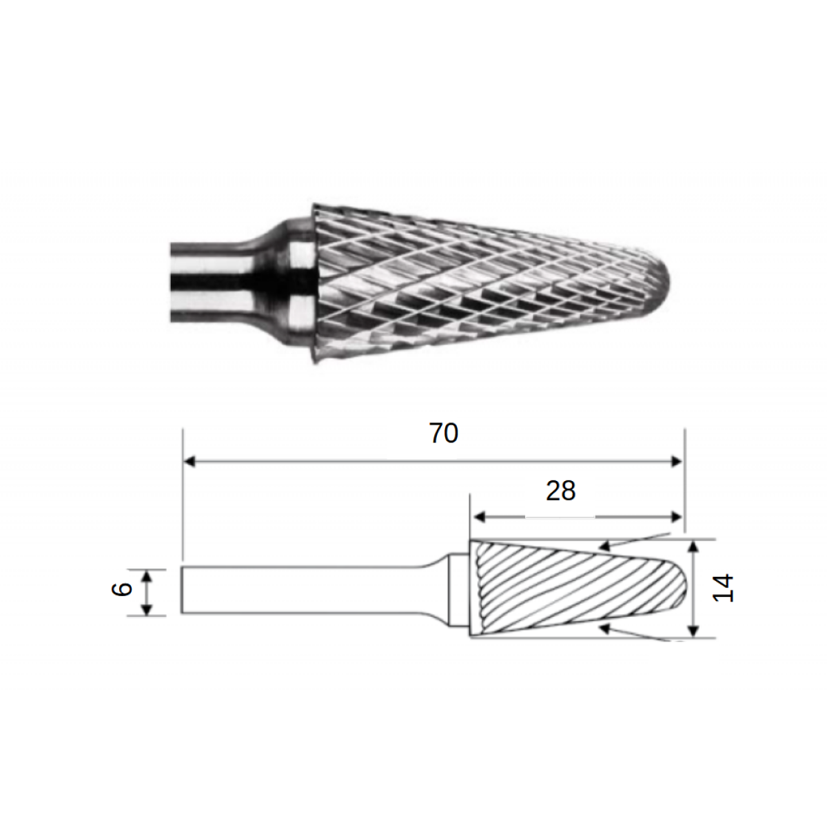 Твердосплавна борфреза тип L сфероконічної форми з кутом 14 градусів. Підходить для обробки важкодоступних місць металевих заготовок. Особливості: Діаметр циліндричного хвостовика 6 мм. Діаметр головки 14 мм. Форма головки: сфероконічної форми, ISO: L. Заточка: подвійна для широкого застосування. Насічка алмазна с різнонаправленими зубцями MX. Довжина робоча 28 мм. Довжина загальна 70 мм. Борфреза виготовлена з твердосплавного карбіду вольфраму. Борфреза використовується для обробки таких матеріалів: деревина, чорні та кольорові метали, чавун, вуглецева сталь, легована сталь, нержавіюча сталь, конструкційна сталь, мідь, алюміній, латунь, цинк, нікелеві і нікель-кобальтові сплави, деревовміскі матеріали (фанера, ДСП, МДФ), пластикові матеріали(ABS, ПВХ, alucobond), природній камінь(граніт, мармур, кераміка, кість), і також інших матеріалів. Сумісні з будь-яким ротаційним інструментом з цангою 6 мм. Підходить для прямошліфувальних машин. Дана фреза - це відмінний вибір для металообробки, деревообробки, різьби, гравіювання, полірування, зняття фасок, канавок, обробки складних поверхонь. Оброблена поверхня стає абсолютно гладкою, і не потребує фінішної доробки. Твердосплавні фрези відрізняються довгим терміном служби, простотою в використанні, надійністю, низьким рівнем вібрації і забезпечують максимальну ефективність і чистоту обробки. Термін служби такої твердосплавної фрези в десятки разів вище, ніж у фрез з швидкорізальної сталі (HSS).