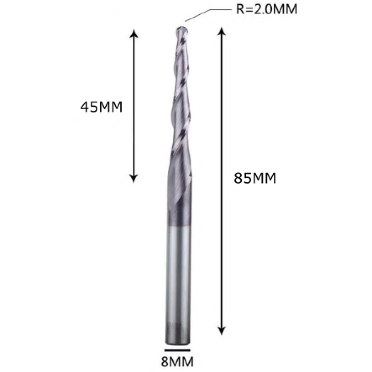 Фреза конусна спіральна із сферичним торцем. Фрези виготовлені з якісного твердосплавного матеріалу. Дані фрези відмінно підходять для обробки глибоких рельєфів. Добре відводять стружку із зони різання залишаючи чистий рез. Висока твердість і зносостійке покриття забезпечує тривалий термін служби інструменту.