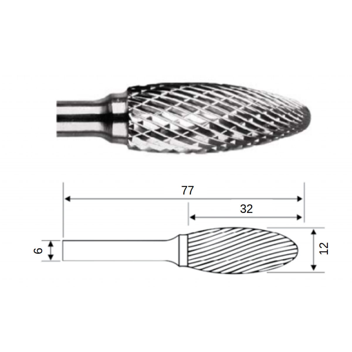 Твердосплавна борфреза тип H форми полум“я. Підходить для обробки металевих заготовок вузьких форм, а також для зняття грата, зачищення зварних швів. Особливості: Діаметр циліндричного хвостовика 6 мм. Діаметр головки 12 мм. Форма головки: форма полум“я, ISO: H. Заточка: подвійна для широкого застосування. Насічка алмазна с різнонаправленими зубцями MX. Довжина робоча 32 мм. Довжина загальна 77 мм. Борфреза виготовлена з твердосплавного карбіду вольфраму. Борфреза використовується для обробки таких матеріалів: деревина, чорні та кольорові метали, чавун, вуглецева сталь, легована сталь, нержавіюча сталь, конструкційна сталь, мідь, алюміній, латунь, цинк, нікелеві і нікель-кобальтові сплави, деревовміскі матеріали (фанера, ДСП, МДФ), пластикові матеріали(ABS, ПВХ, alucobond), природній камінь(граніт, мармур, кераміка, кість), і також інших матеріалів. Сумісні з будь-яким ротаційним інструментом з цангою 6 мм. Підходить для прямошліфувальних машин. Дана фреза - це відмінний вибір для металообробки, деревообробки, різьби, гравіювання, полірування, зняття фасок, канавок, обробки складних поверхонь. Оброблена поверхня стає абсолютно гладкою, і не потребує фінішної доробки. Твердосплавні фрези відрізняються довгим терміном служби, простотою в використанні, надійністю, низьким рівнем вібрації і забезпечують максимальну ефективність і чистоту обробки. Термін служби такої твердосплавної фрези в десятки разів вище, ніж у фрез з швидкорізальної сталі (HSS).