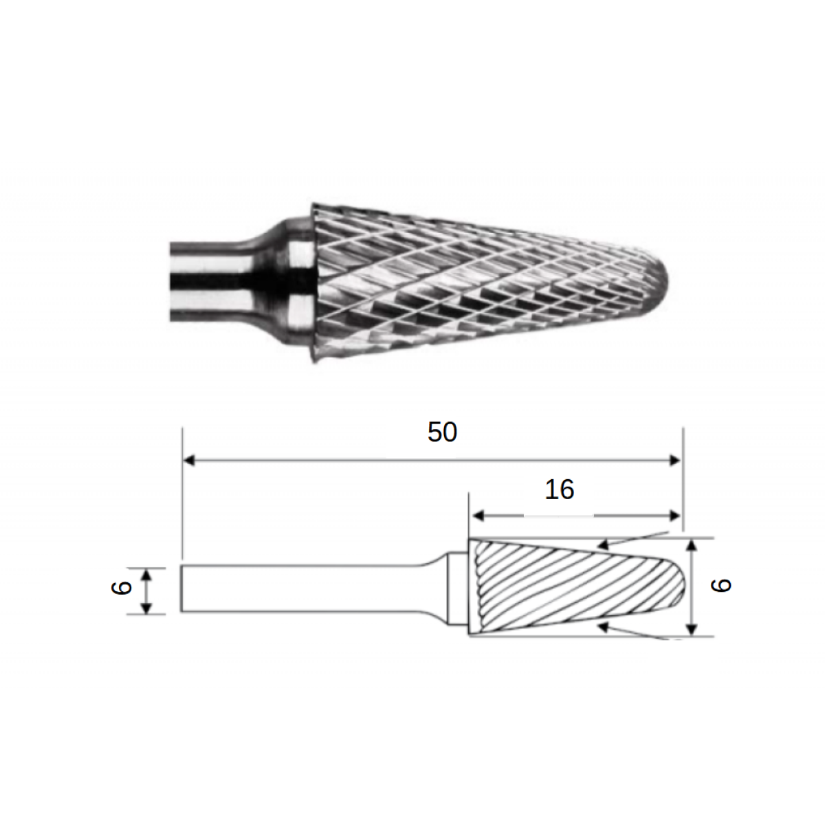 Борфреза твердосплавная сфероконическая 6x16 хвостовик 6 мм