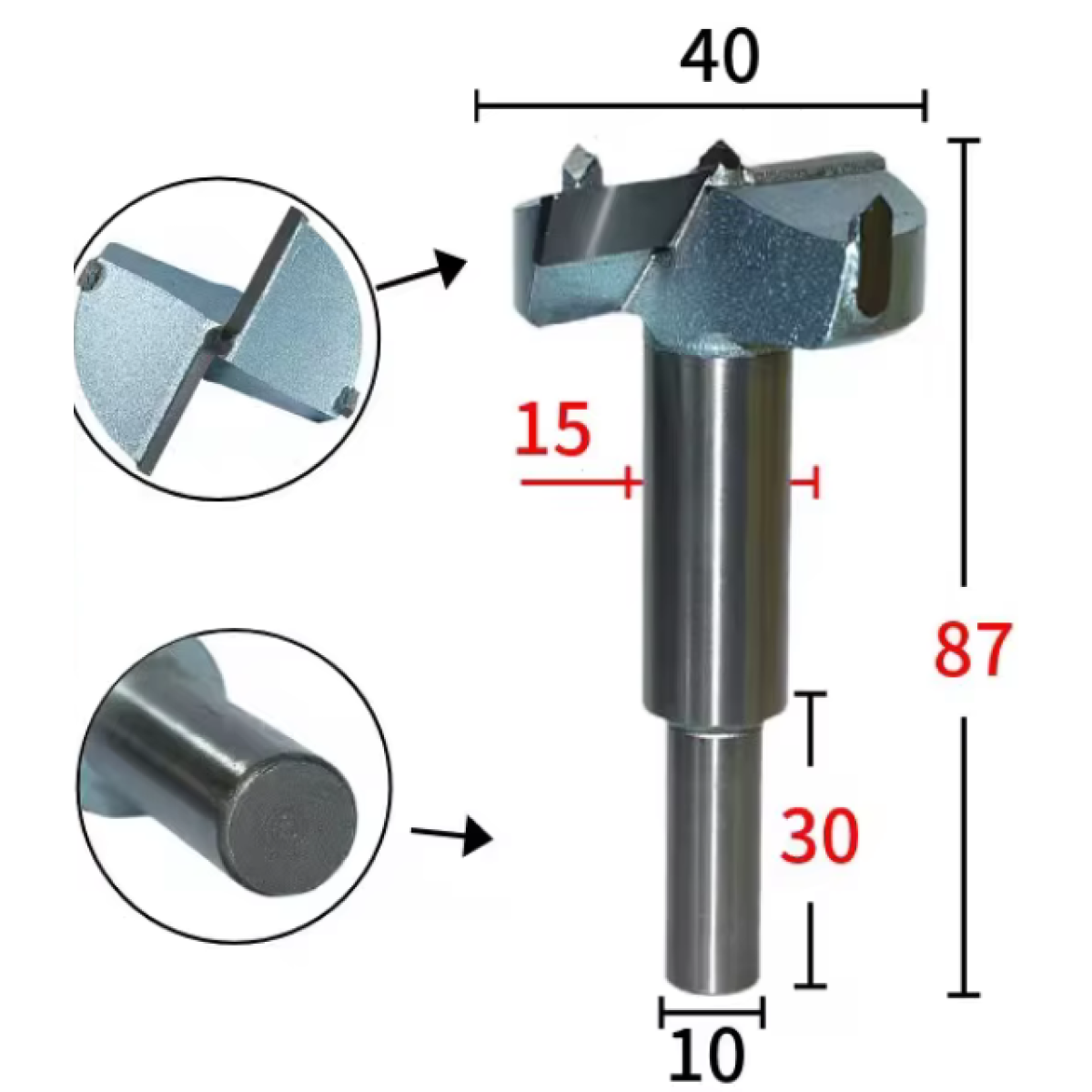 • свердло Форстнера (чашкові свердла) для вибірки паза під петлю має круглий хвостовик з діаметром 10 мм і розрахований саме для використання в ручному фрезері